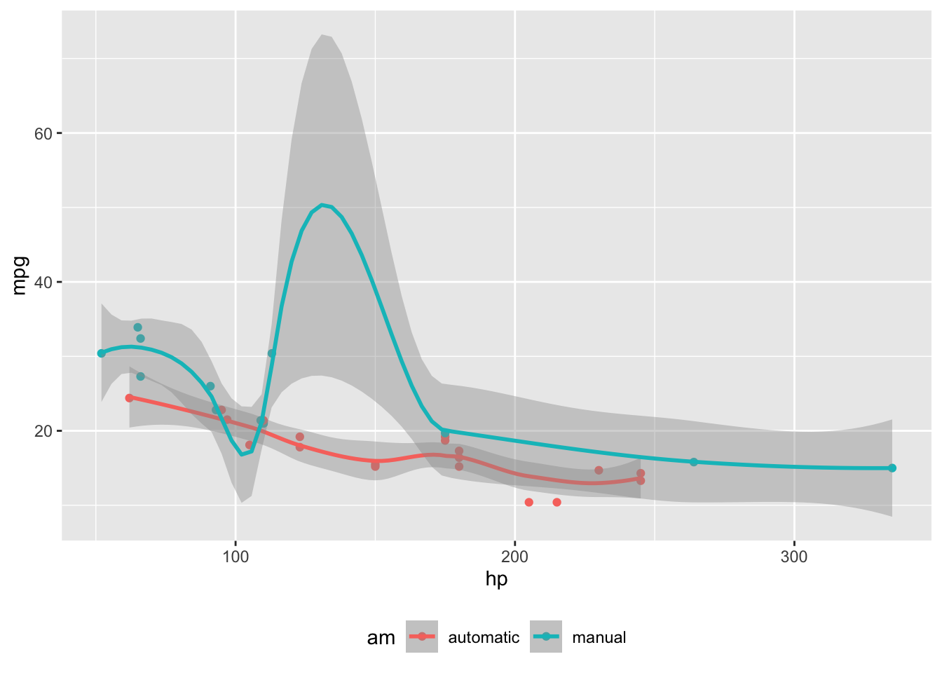 Figure 1: MPG vs horsepower, colored by transmission.