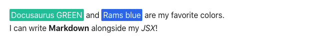 <Highlight color="#25c2a0">Docusaurus GREEN</Highlight> and <Highlight color="#1877F2">Rams blue</Highlight> are my favorite colors.